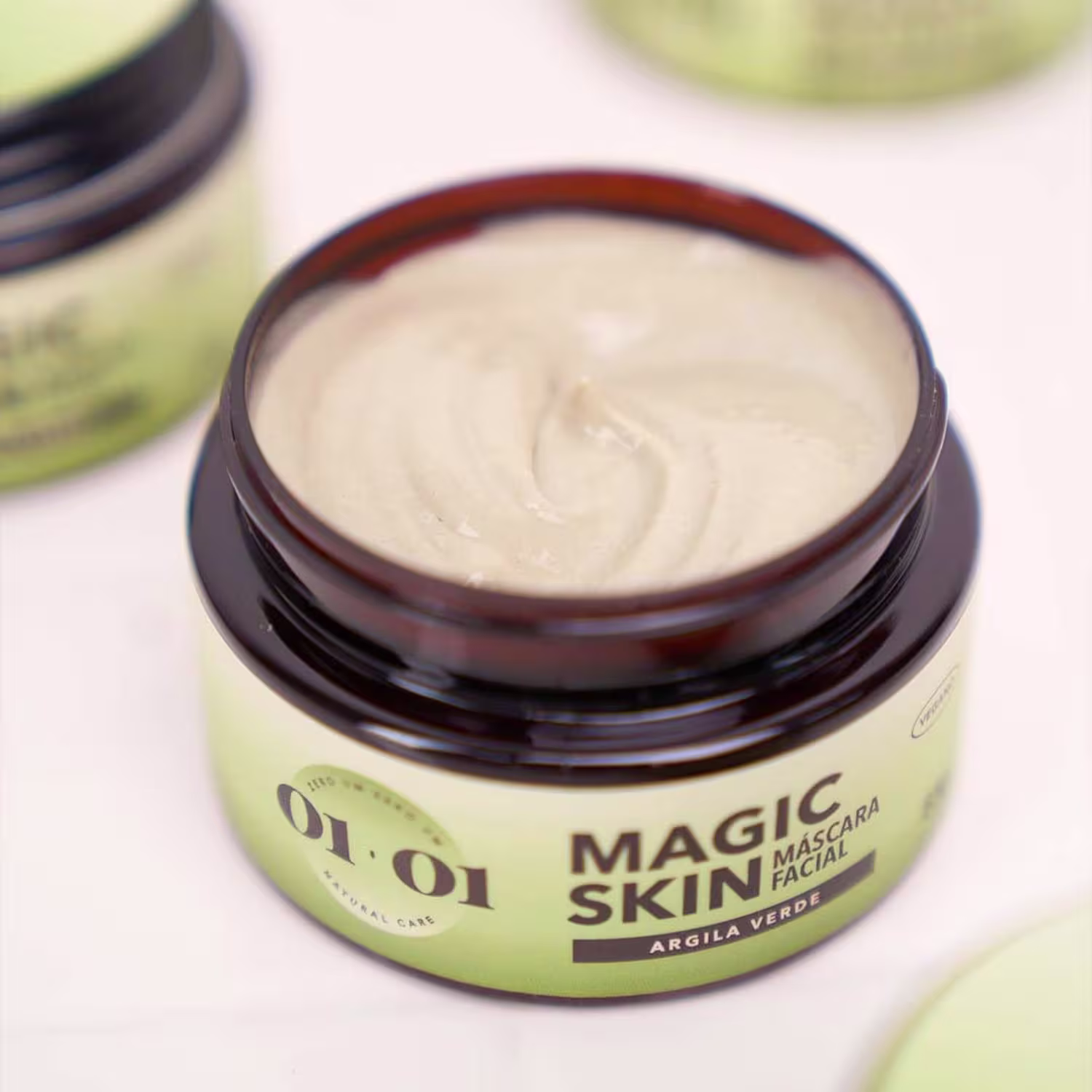 Máscara facial para peles oleosas. 0101 Natural Care Magic Skin Argila Verde com ação detox, secativa e anti-inflamatória é ideal para controlar a oleosidade.