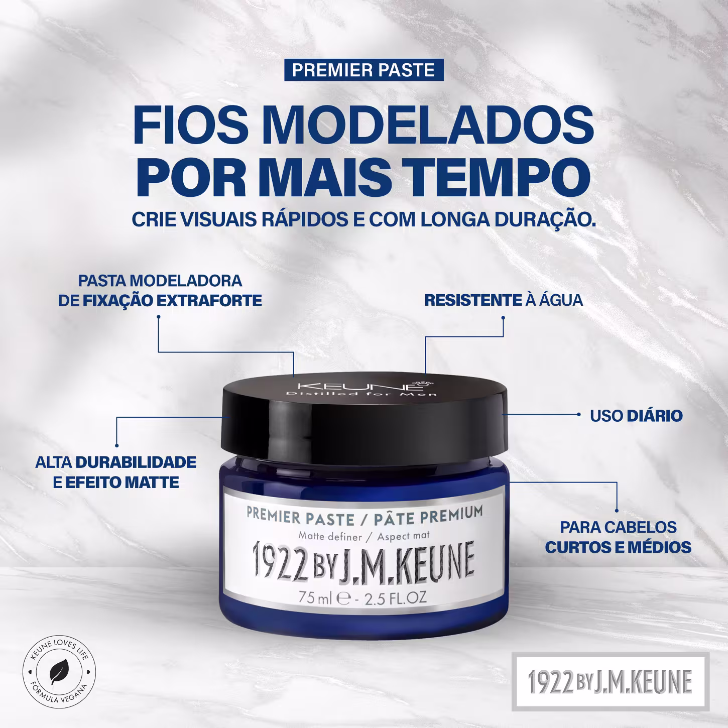 Pasta modeladora masculina com acabamento matte. Keune 1922 by J. M. Keune Premier é ideal para estilizar os fios na hora de criar visuais rápidos e com longa duração.