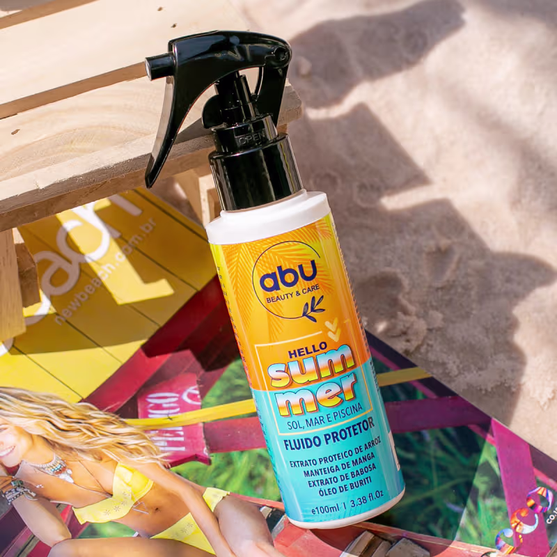 Fluido Protetor Térmico. Abu Cosméticos Hello Summer ajuda a proteger a cor e mechas dos fios durante a exposição solar.