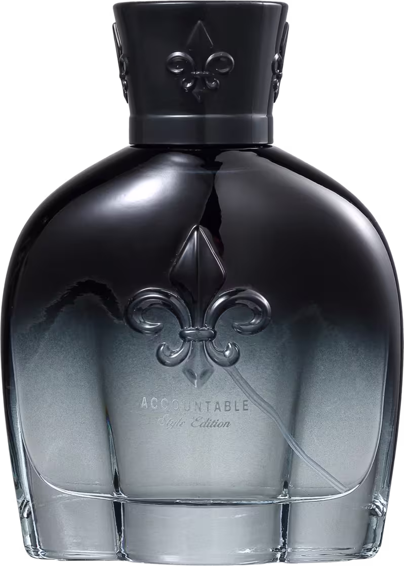 O frasco do perfume Accountable Style Edition vem em um degradê do preto ao grafite para remeter à sofisticação. A estampa relembra os antigos brasões e escudos da realeza francesa.