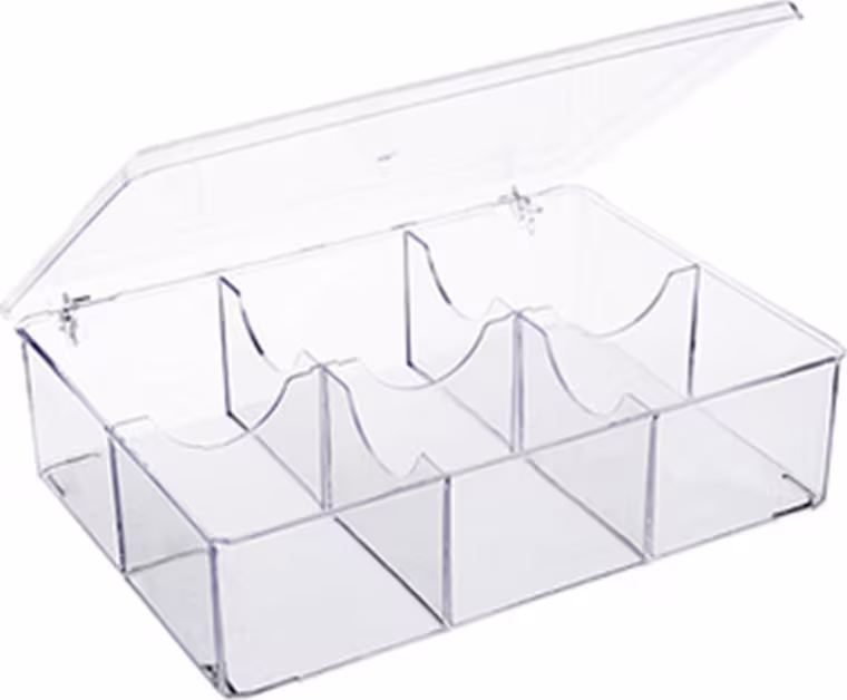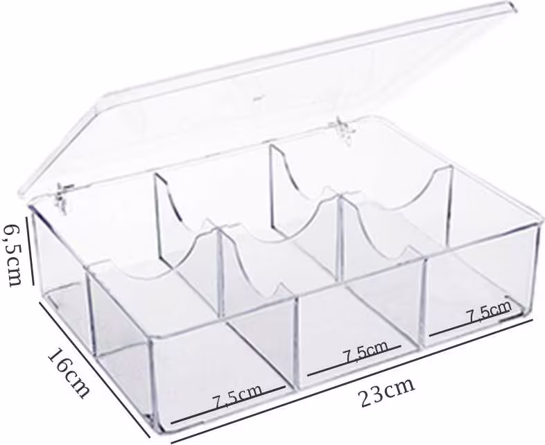 A Caixa Organizadora Acrílico Store com 6 Divisórias em PS transparente, possui tampa retrátil e 6 divisórias internas 7,5 x 7,5 cm, que organizam diversos itens como cosméticos, algodão, perfumes, batons, esmaltes, cotonete, etc.
