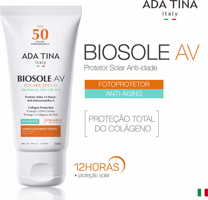 Ada Tina Biosole AV FPS 50 tem ação Redutor de Linhas e antienvelhecimento graças aos seus ativos que protegem o colágeno e o DNA da pele contra a radiação solar. Assim, ajuda a diminuir os sinais de idade e a perda de sustentação do rosto.