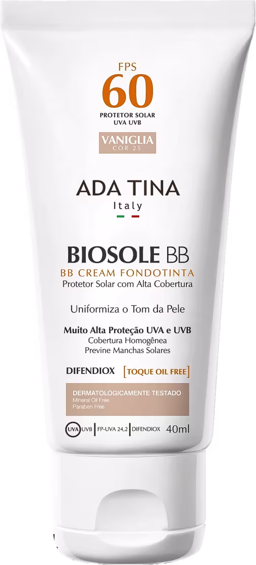 BB cream com alta cobertura. Ada Tina Biosole é perfeito para uniformizar o tom e prevenir as manchas solares.