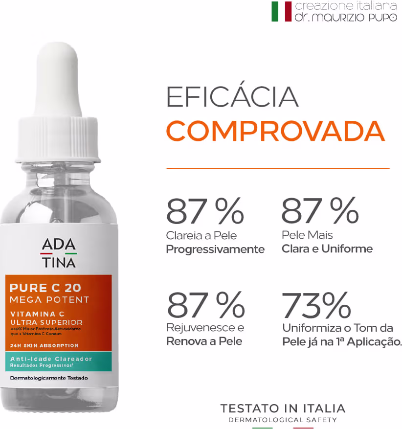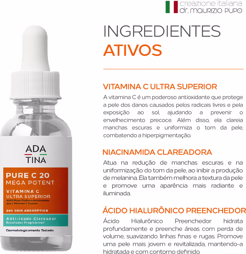 O Sérum Redutor de Marcas Facial Ada Tina Pure C 20 Vitamina C é um tratamento intensivo que transforma visivelmente a pele em apenas 14 dias. Sua fórmula combina Vitamina C estabilizada, Ácido Hialurônico, Niacinamida e Quercetina, atuando em sinergia para reduzir linhas finas, uniformizar o tom e devolver a luminosidade da pele. Com a tecnologia exclusiva Lipoascorbil Acqua, garante 24 horas de absorção contínua e resultados progressivos e duradouros contra marcas e irregularidades.