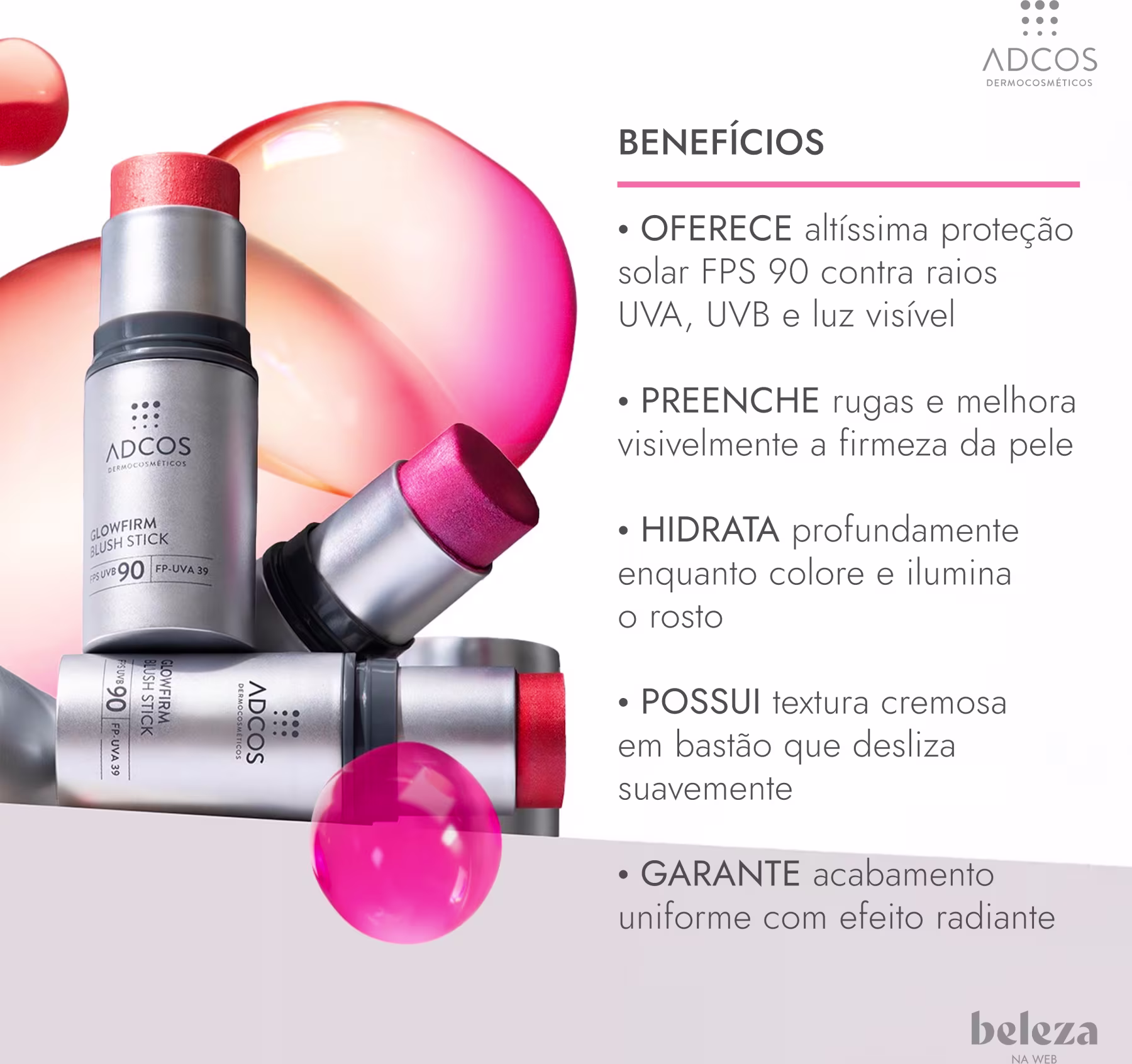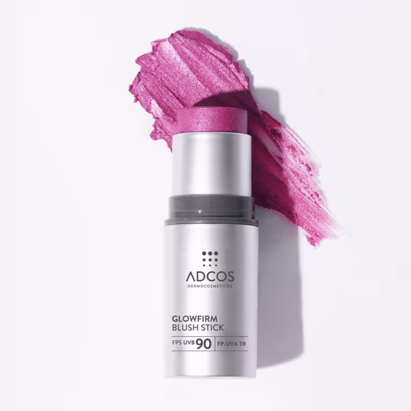 Blush em bastão com proteção solar FPS 90. Adcos Glowfirm textura cremosa, hidratante, preenche rugas e ilumina o tom da pele com efeito radiante.