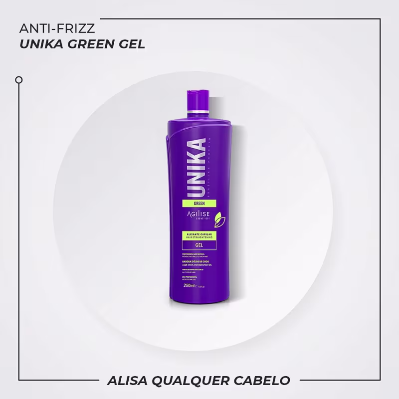 Gel alisante capilar. Agilise Cosméticos Unika Green é um progressiva de alta tecnologia com base em gel, que facilita sua aplicação, aderindo melhor aos fios.
