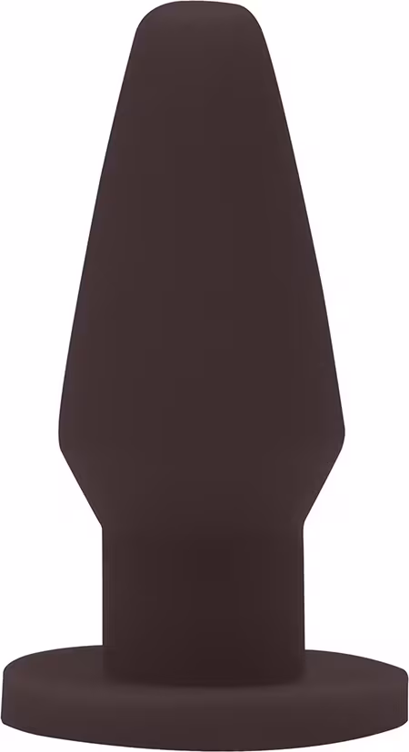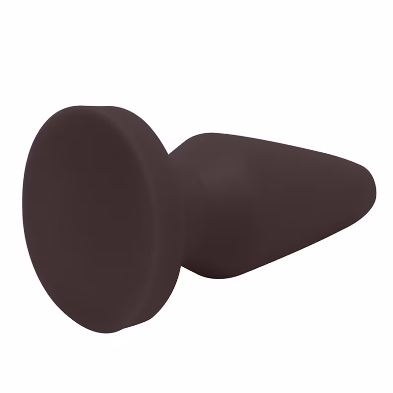 Plug anal em formato cônico com base plana, projetado para uso íntimo. Embalagem simples e discreta, sem rótulos ou marcas visíveis.
