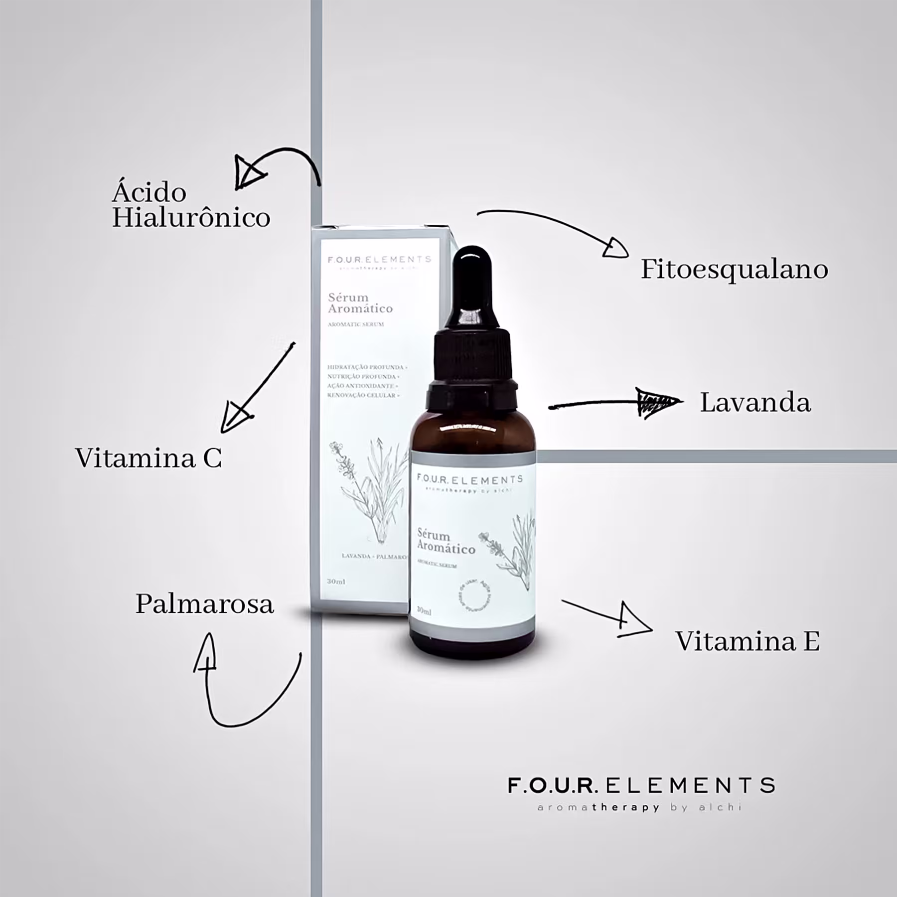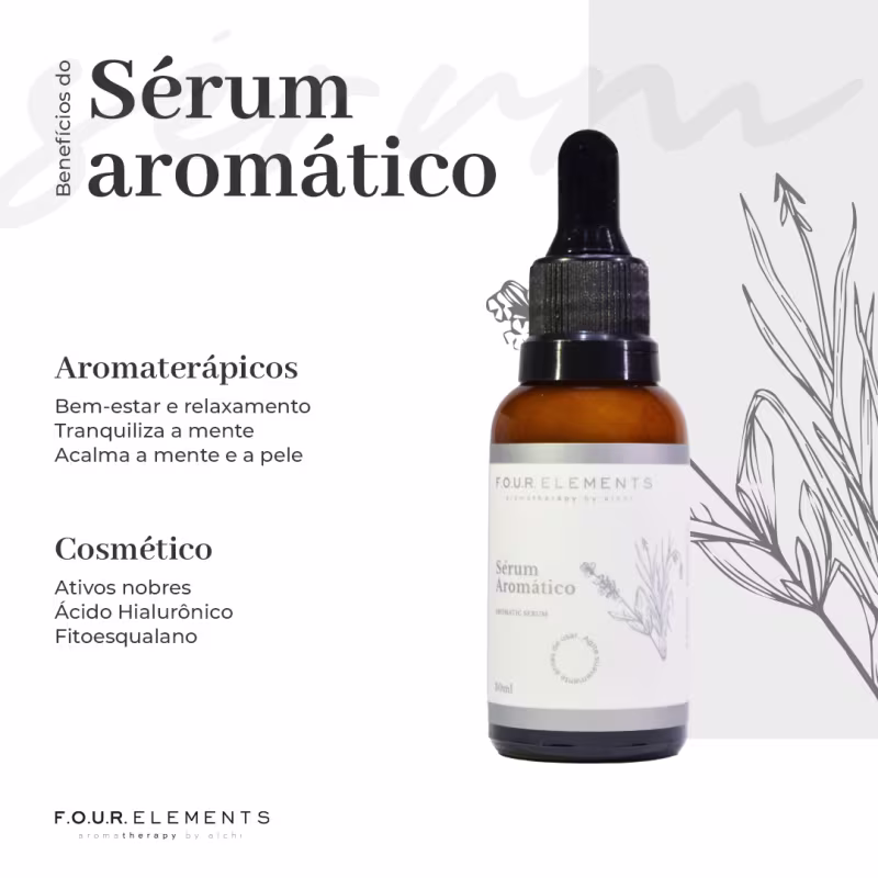 Sérum facial. Alchi Four Elements Aromático Cuidar hidrata e nutre profundamente, estimulando a renovação celular e melhorando a elasticidade e textura da pele. Também deixa a pele com aparência mais jovem, diminuindo irritações e manchas.
