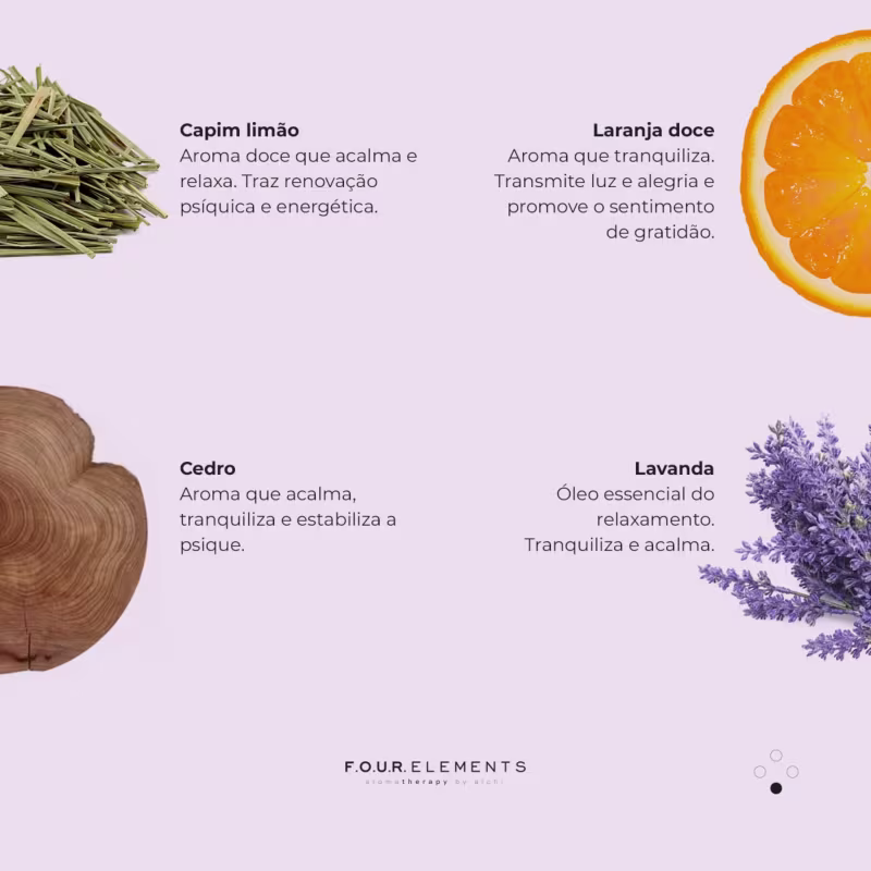 O Óleo Essencial Alchi Four Elements Sinergia Relaxar combina os óleos essenciais de Capim limão, Laranja Doce, Lavanda e Cedro, em uma alquimia única e exclusiva, criando uma atmosfera que estimula o relaxamento, a tranquilidade e a calma. Seu aroma é capaz de transformar qualquer momento do dia em um excelente ritual de relaxamento.