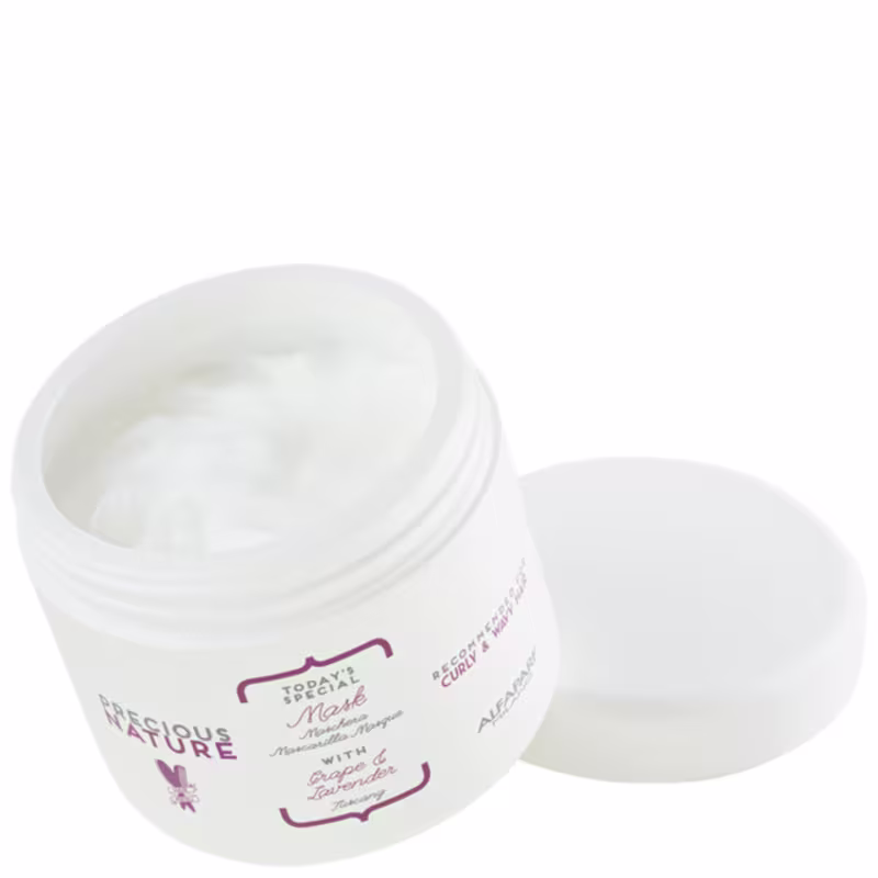 Inspirada em ingredientes típicos da gastronomia italiana, Alfaparf Precious Nature Grape & Lavender Mask confere cachos 15% mais definidos e com durabilidade por até 3 dias. A fórmula suave com Soro de Uvas e Cera de Flor de Lavanda proporciona nutrição e hidratação sem pesar nos fios. Resultado de cachos mais definidos, hidratados e livres do efeito arrepiado. A linha Precious Nature não apresenta sulfatos, parabenos, parafinas, óleos minerais e corantes.