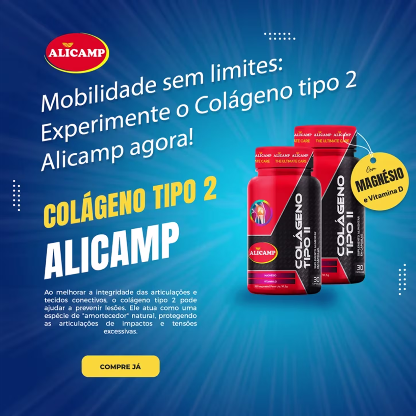 Não sei o CEPSuplemento alimentar. Alicamp Colágeno Tipo 2 promove regeneração da cartilagem, alivia dores articulares e confere elasticidade à pele, cabelos e unhas.
