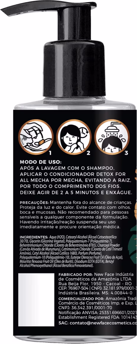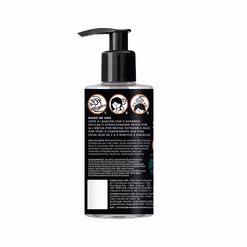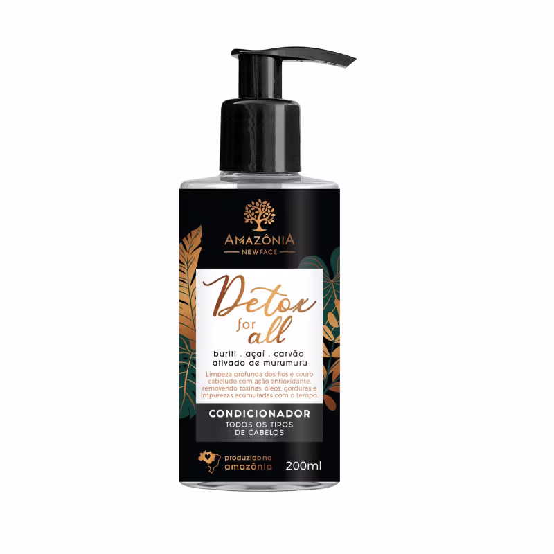 O Condicionador Amazônia New Face Detox For All conta com ativos que auxiliam na remoção de radicais livres, toxinas, óleos, gorduras, metais pesados e outras impurezas. Além disso, controla o excesso de oleosidade, ameniza o frizz e deixa as madeixas ainda mais bonitas.