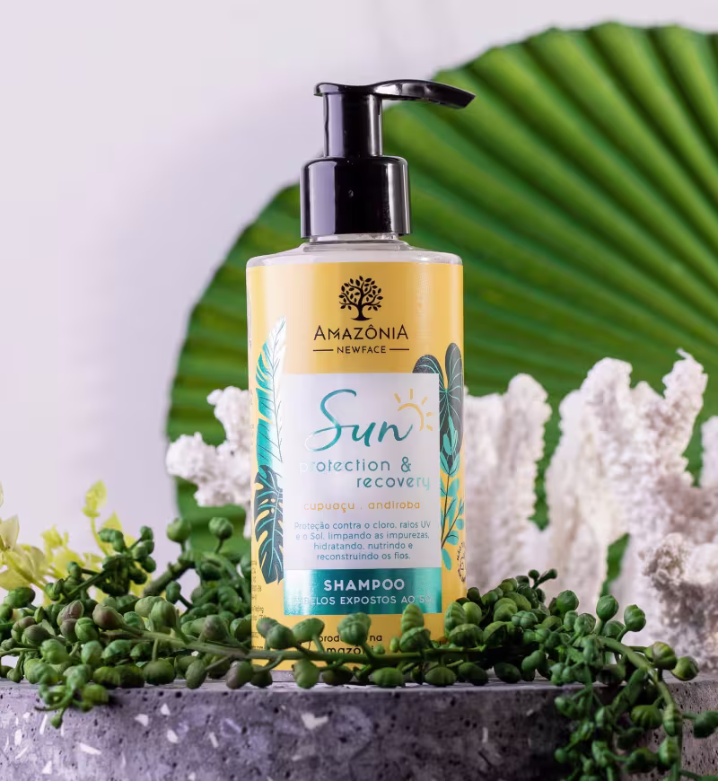 Shampoo para cabelos expostos ao sol. Amazônia New Face Sun Protection & Recovery protege os fios da ação do cloro e dos raios UV causados pela exposição solar.