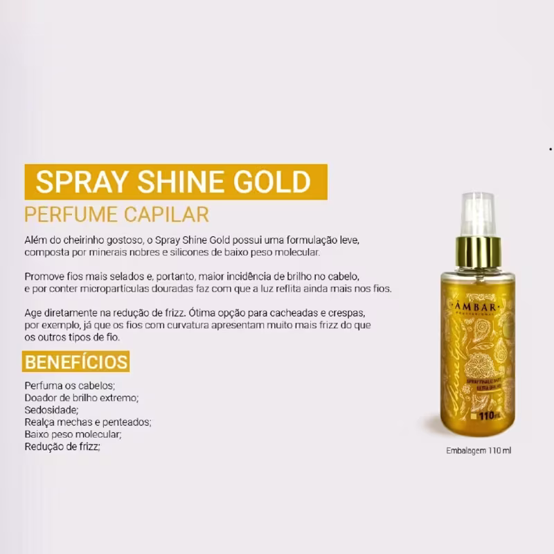 Spray Finalizador Capilar para cabelos cacheados e crespos. Âmbar Profissional Shine Gold garante fios mais selados e com menos frizz.