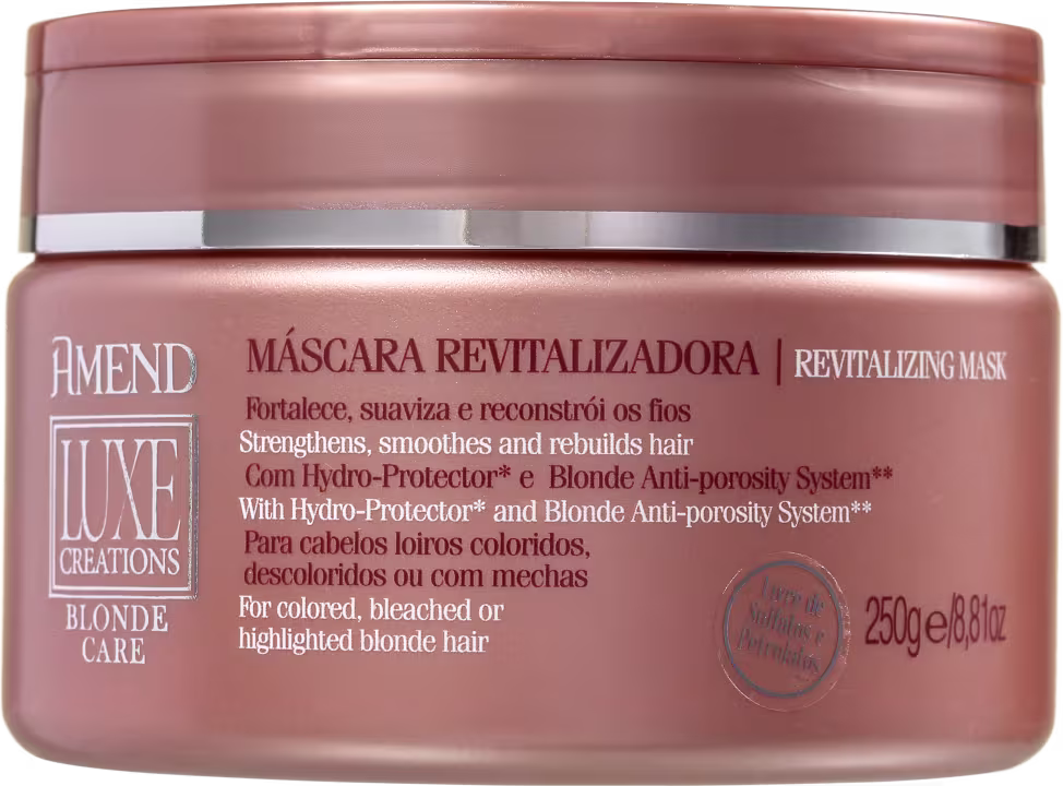 Máscara para cabelos loiros coloridos, descoloridos ou com mechas. Amend Luxe Creations Blonde Care Máscara reconstrói e hidrata intensamente. Combate a porosidade, devolve a elasticidade e revitaliza os fios.