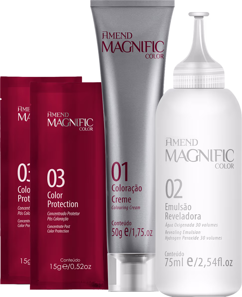 Coloração permanente em creme. Amend Magnific Color traz tons vibrantes que promovem cobertura perfeita dos fios brancos.