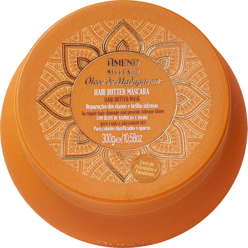 Máscara Capilar para cabelos danificados. Amend Millenar Óleos de Madagascar hidrata profundamente enquanto nutre e recupera a maciez.