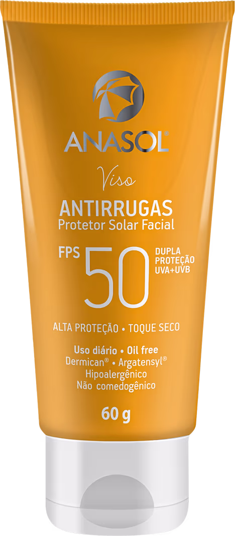 O Protetor Solar Facial Anasol Viso Antirrugas FPS50 traz alta proteção contra os raios UVA/UVB, além de melhorar a textura da pele. Sua fórmula oil free garante toque seco e seus ativos auxiliam na hidratação e reestruturação da firmeza da derme. Não tem fragrância, é hipoalergênico, não-comedogênico e dermatologicamente testado.