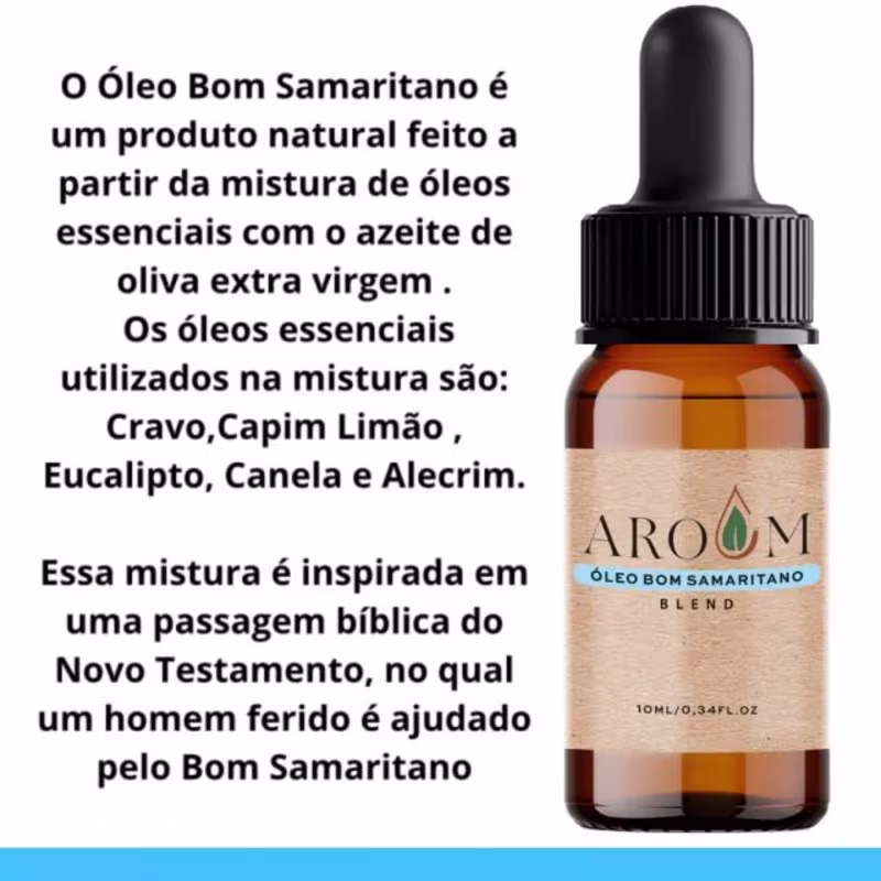 O Óleo Essencial Aroom Aromaterapia Blend Bom Samaritano é um produto natural feito a partir da mistura de óleos essenciais com o Azeite de Oliva Extra Virgem. Essa mistura é inspirada em uma passagem bíblica do Novo Testamento, no qual um homem ferido é ajudado pelo Bom Samaritano.