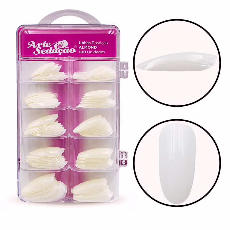 01 - Caixa Acrílica com 100 Unidades de Unhas Postiças Formato Almond Amendoadas