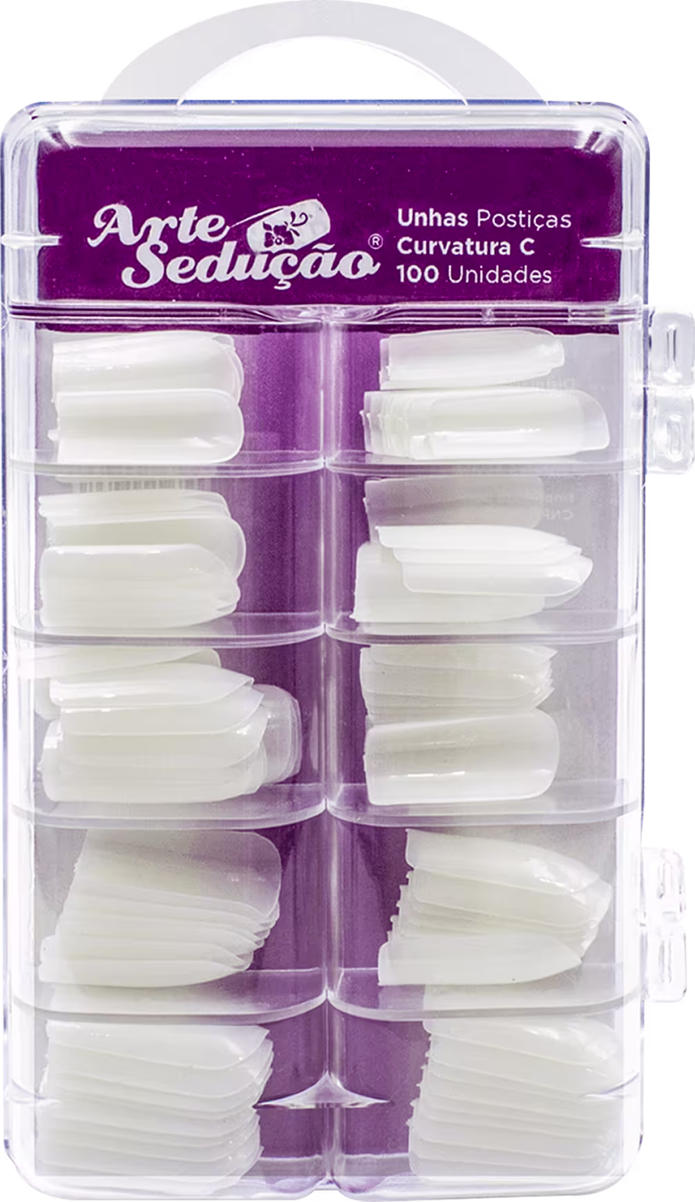 As Unhas Postiças Arte Sedução Curvatura C são artificiais, na cor transparente e do tipo natural. São um ótimo custo benefício, acompanhando caixa acrílica com divisões para armazenamento que garantem que estejam sempre organizadas. Todas as unhas são numeradas, facilitando a aplicação e a distinção de tamanhos.