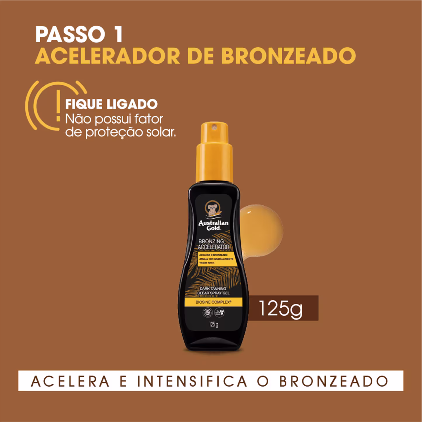 Bronzeador em spray gel para todos os tipos de pele. Bronzeador Spray Gel Australian Gold Bronzing Accelerator promove uma aceleração do bronzeado, ativando a cor gradualmente.