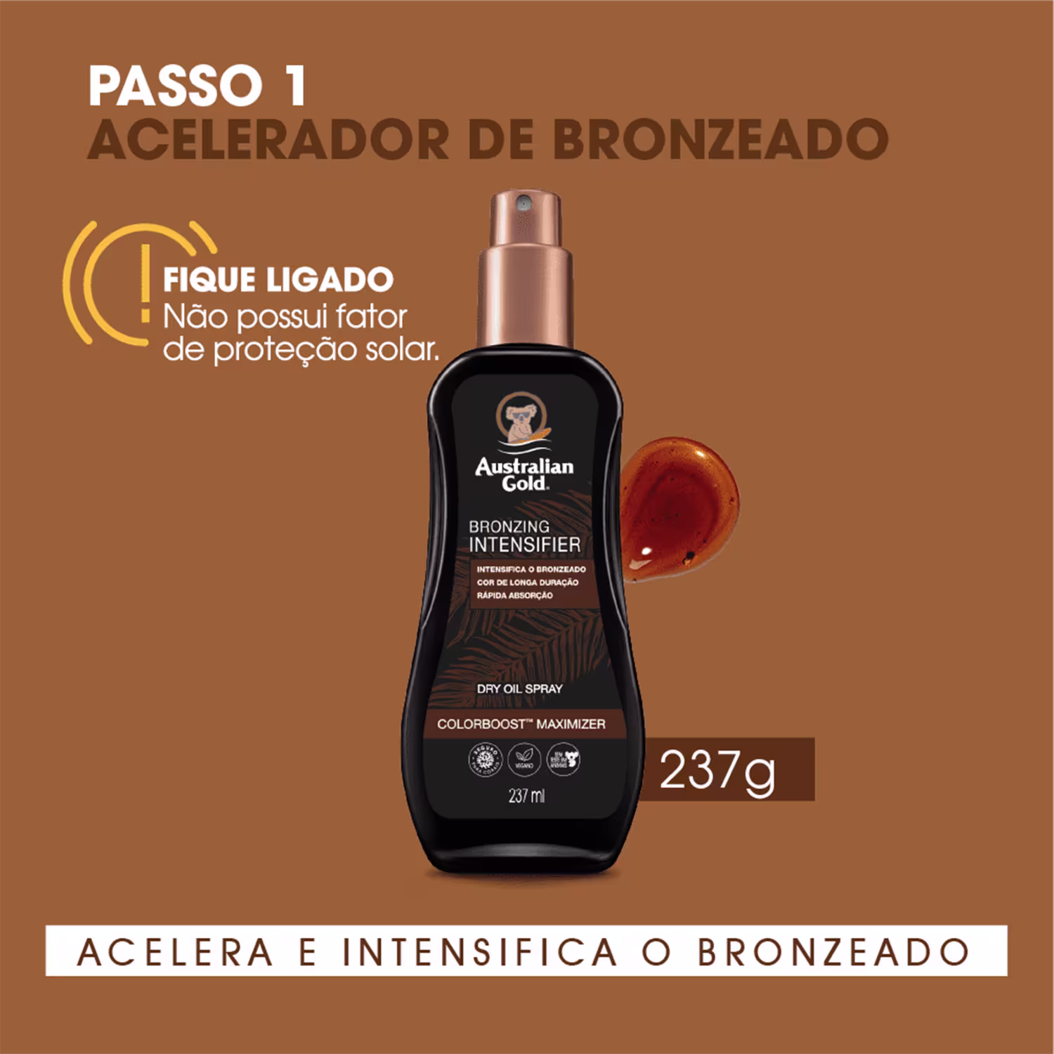 Spray intensificador de bronzeado para todos os tipos de pele. Australian Gold Bronzing Intensifier estimula e acelera o processo de pigmentação.