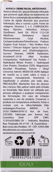 Avenca Idealy 35+ Antissinais contem fórmula leve, de rápida absorção, que melhora a hidratação e revitaliza, para evitar o aspecto cansado. Contém vitamina C e colágeno, que evitam a perda de elasticidade e controlam a ação dos radicais livres.