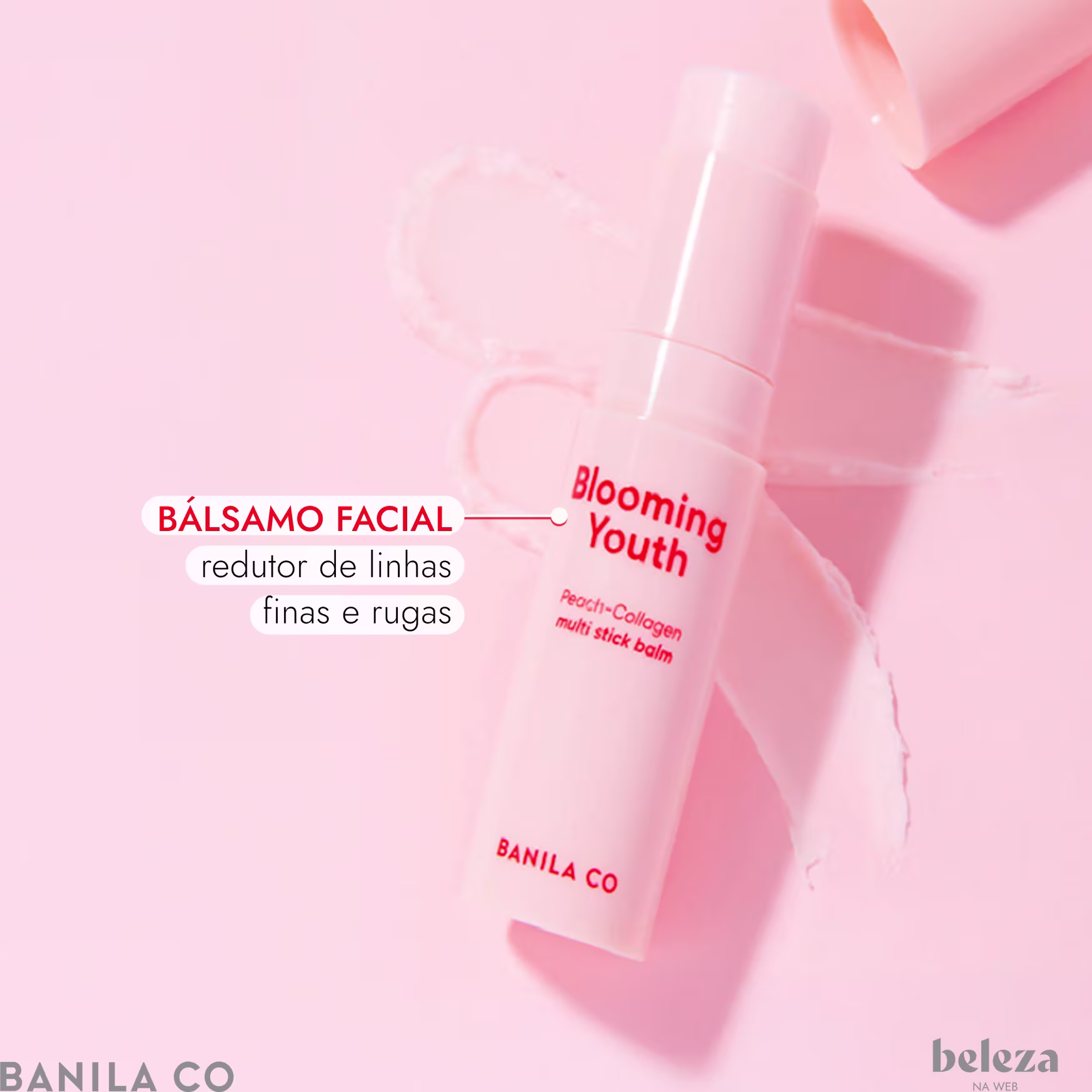 O Bálsamo Facial Banila CO Blooming Youth Peach-Collagen Multi Stick Balm é indicado para iniciar a sua rotina de cuidados antienvelhecimento. Garante sensação imediata de frescor e explosão de hidratação graças à sua fórmula enriquecida com 37% de ingredientes hidratantes solúveis em água, absorvida perfeitamente pela sua pele, sem deixar sensação pegajosa, proporcionando um acabamento refrescante. É, ainda, suave, vegano e livre de ingredientes de origem animal.