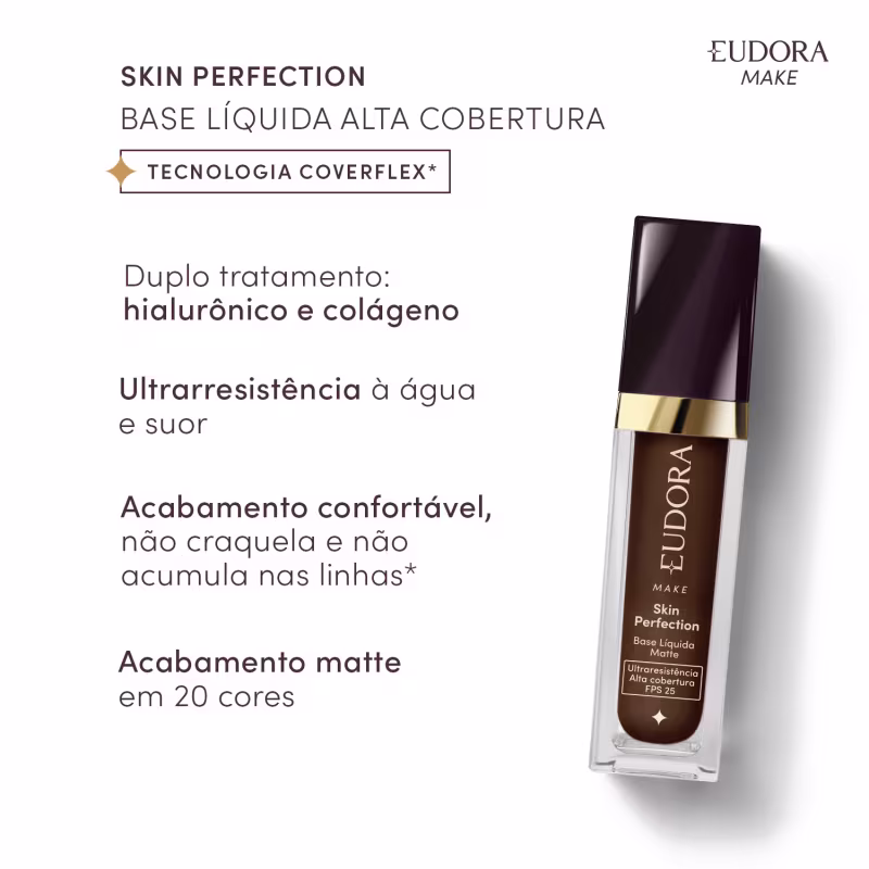 Para quem deseja conquistar uma pele impecável com controle de oleosidade e alta cobertura sem abrir mão do tratamento, a Base Líquida Matte Eudora Skin Perfection entrega um acabamento matte aveludado de longa duração.