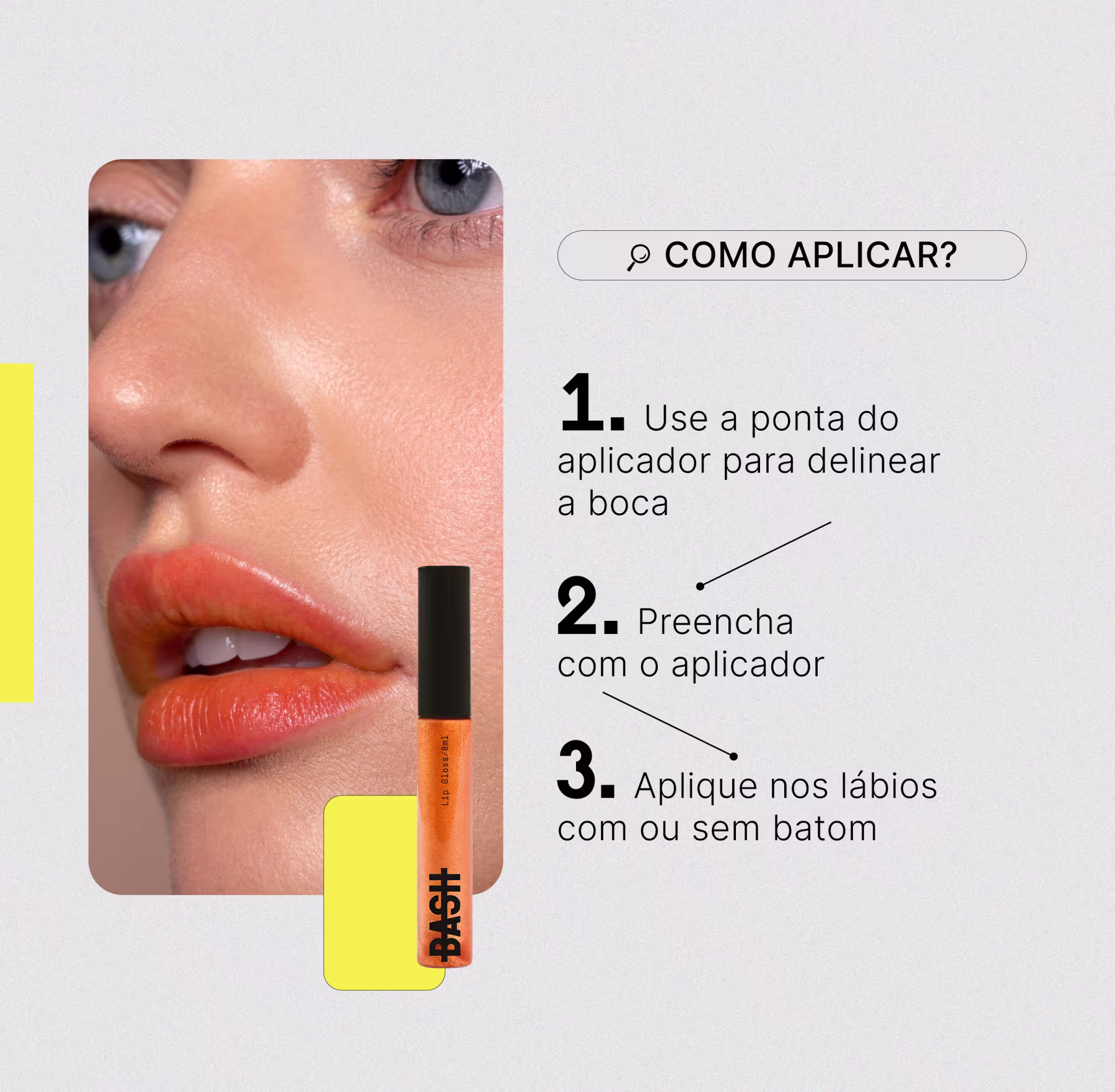 O Lip Gloss BASH Beauty possui fórmula super hidratante, enriquecida com Ácido Hialurônico e Vitamina E, proporcionando assim lábios hidratados, firmes e com a textura suave. O lip gloss desliza suavemente, proporcionando um acabamento luminoso e confortável. Sinta-se poderosa e confiante com um toque de brilho que realça sua beleza natural.