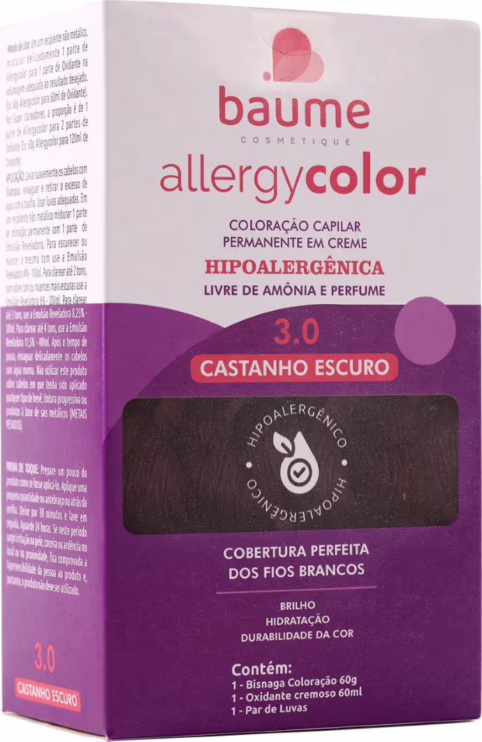 Coloração permanente. Baume Allergycolor foi desenvolvida pensando na qualidade de total cobertura de fios brancos, é hipoalergênica e livre de substâncias sensibilizantes.