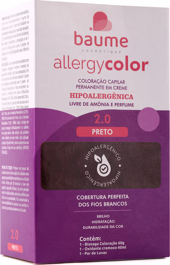 Coloração permanente. Baume Allergycolor foi desenvolvida pensando na qualidade de total cobertura de fios brancos, é hipoalergênica e livre de substâncias sensibilizantes.
