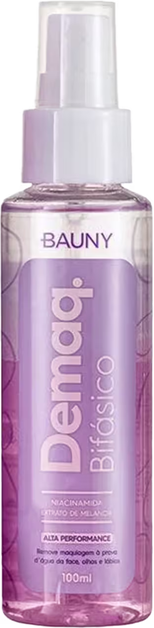Demaquilante bifásico. Bauny Cosméticos proporciona uma limpeza eficiente ao rosto, removendo todo resíduo de maquiagem.