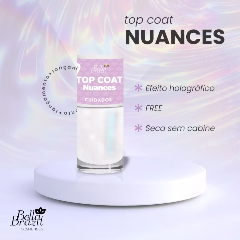 O Top Coat Bella Brazil Nuances 334 pode ser usado sozinho para um look único ou sobre seu esmalte favorito para um toque especial. Seu efeito holográfico cria tons diferentes nas unhas que mudam conforme a luz, garantindo um visual sempre surpreendente. E o melhor: é um esmalte FREE, livre de substâncias que causam alergias, como tolueno, formaldeído e DBP.