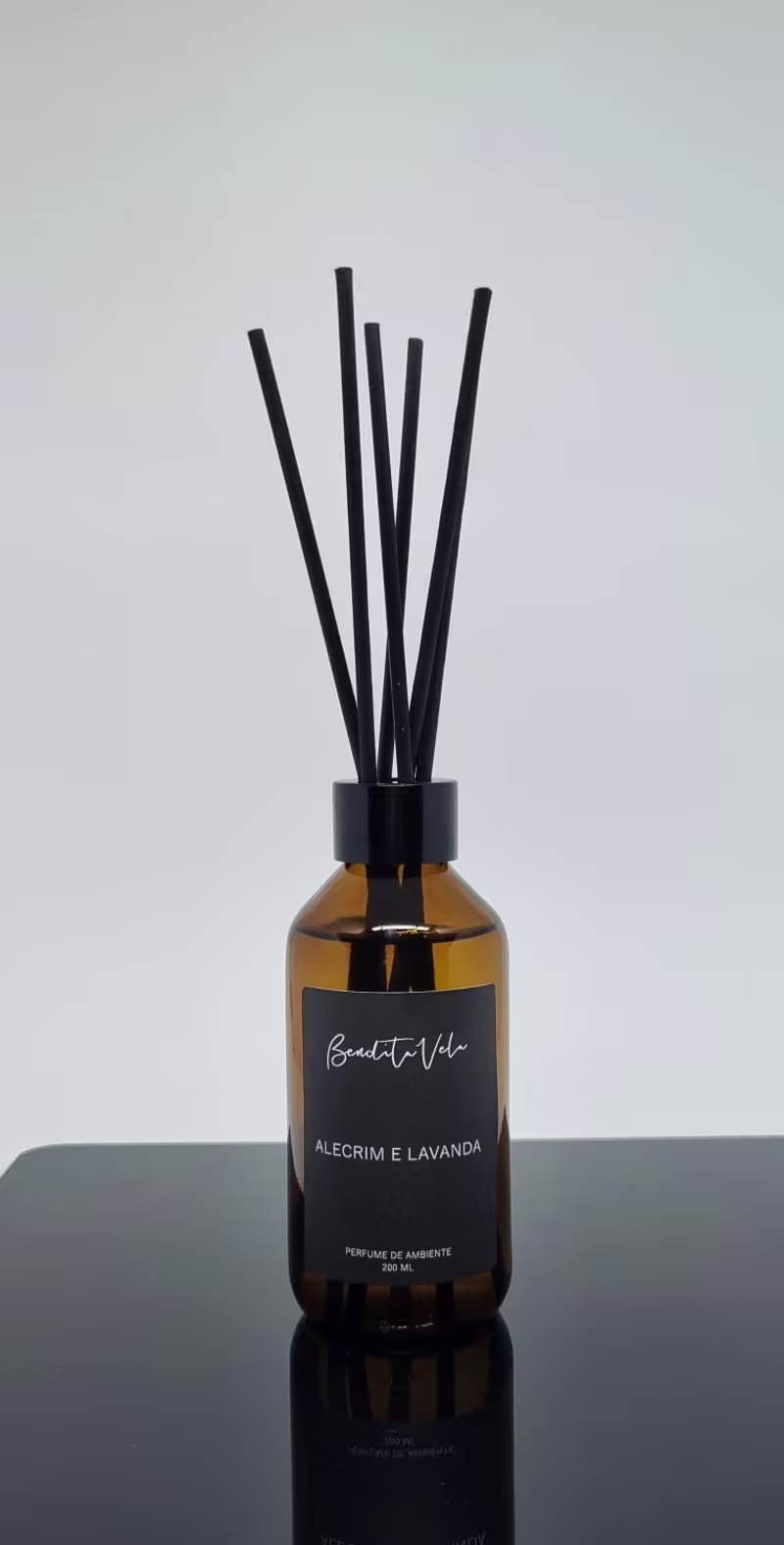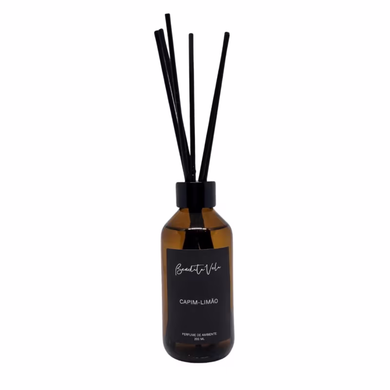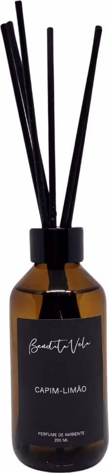 O Aromatizador de Ambiente Bendita Vela Capim-Limão apresenta aroma fresco, picante e levemente cítrico. Acompanha 6 varetas de fibra na cor preta.