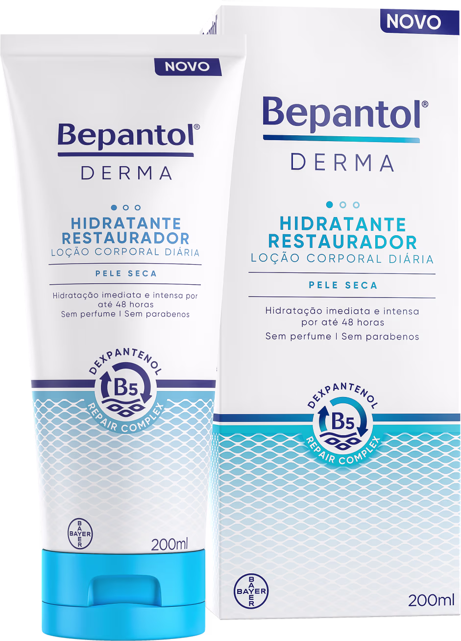 Loção corporal hidratante. Bepantol Derma Restaurador acalma e suaviza a pele ressecada desde a primeira aplicação.