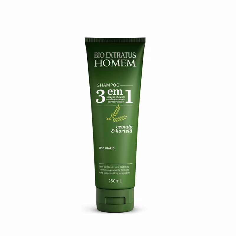 O Shampoo Bio Extratus Homem 3 em 1 é uma fórmula versátil que combina os benefícios nutritivos da cevada com a sensação refrescante da hortelã. Além de limpar e condicionar os cabelos, facilita o deslizamento da lâmina durante o barbear, proporcionando uma pele macia e perfumada. Ideal para homens que buscam praticidade e eficácia em um único produto.
