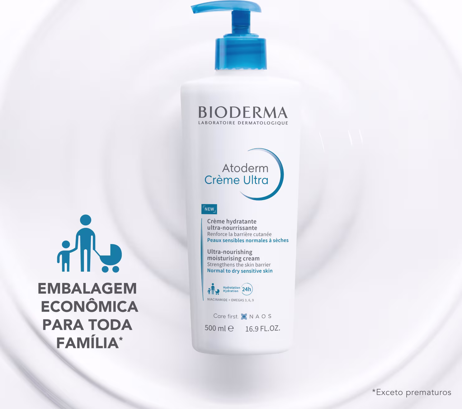 Hidratante corporal diário ultra sensorial e eficaz para peles normais e secas. Bioderma Atoderm Crème Ultra realiza a hidratação imediata e de forma duradoura, aumentando a suavidade e elasticidade da tez.