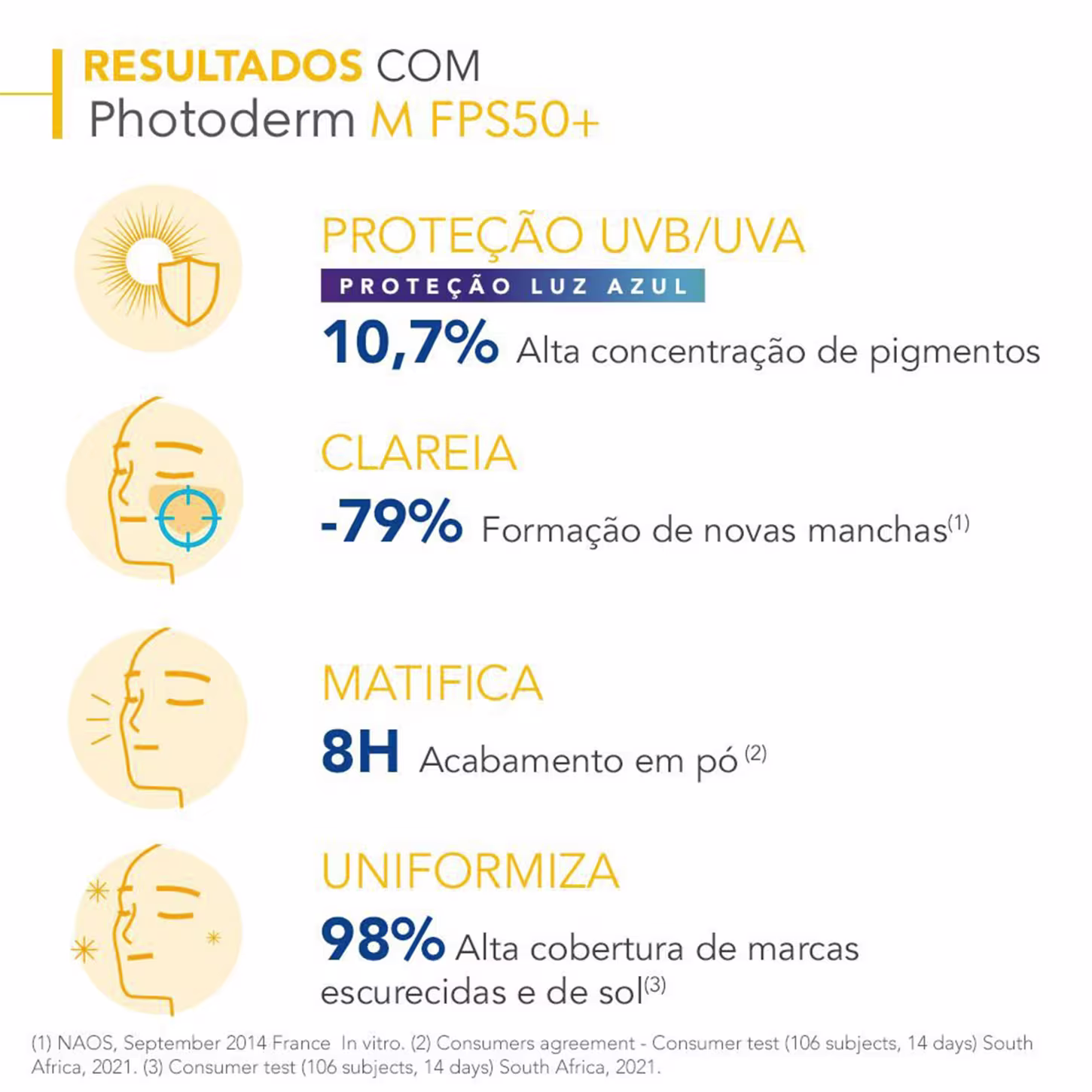 Protetor solar com cor para todos os tipos de pele. Bioderma Photoderm M FPS50+ ajuda a proteger o rosto com ação uniformizadora do tom, além de matificar. Com alta concentração de pigmentos para camuflar marcas escuras de maneira eficiente.