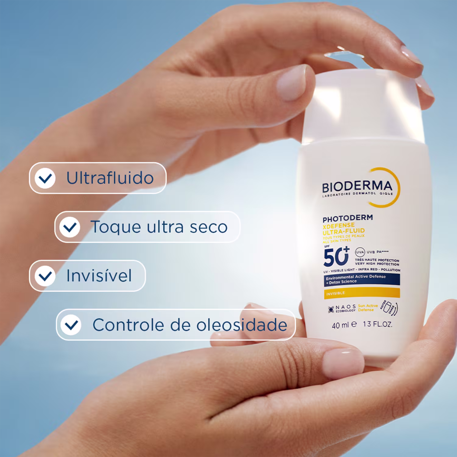 Protetor solar ultrafluido com cor. Bioderma Photoderm XDefense SPF 50+ traz defesa global contra poluição, raios UV e radicais livres, toque seco e acabamento invisível para todos os tipos de pele. É uma solução inovadora para proteção solar diária, desenvolvida para atender às necessidades de todos os tipos de pele, incluindo peles oleosas e sensíveis.