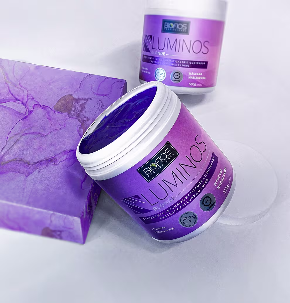 Máscara matizadora para cabelos loiros ou descoloridos. A Biofios Profissional Luminos Blonde neutraliza tons indesejados enquanto trata os fios, garantindo uma cor perfeita sem desgastar ou ressecar.