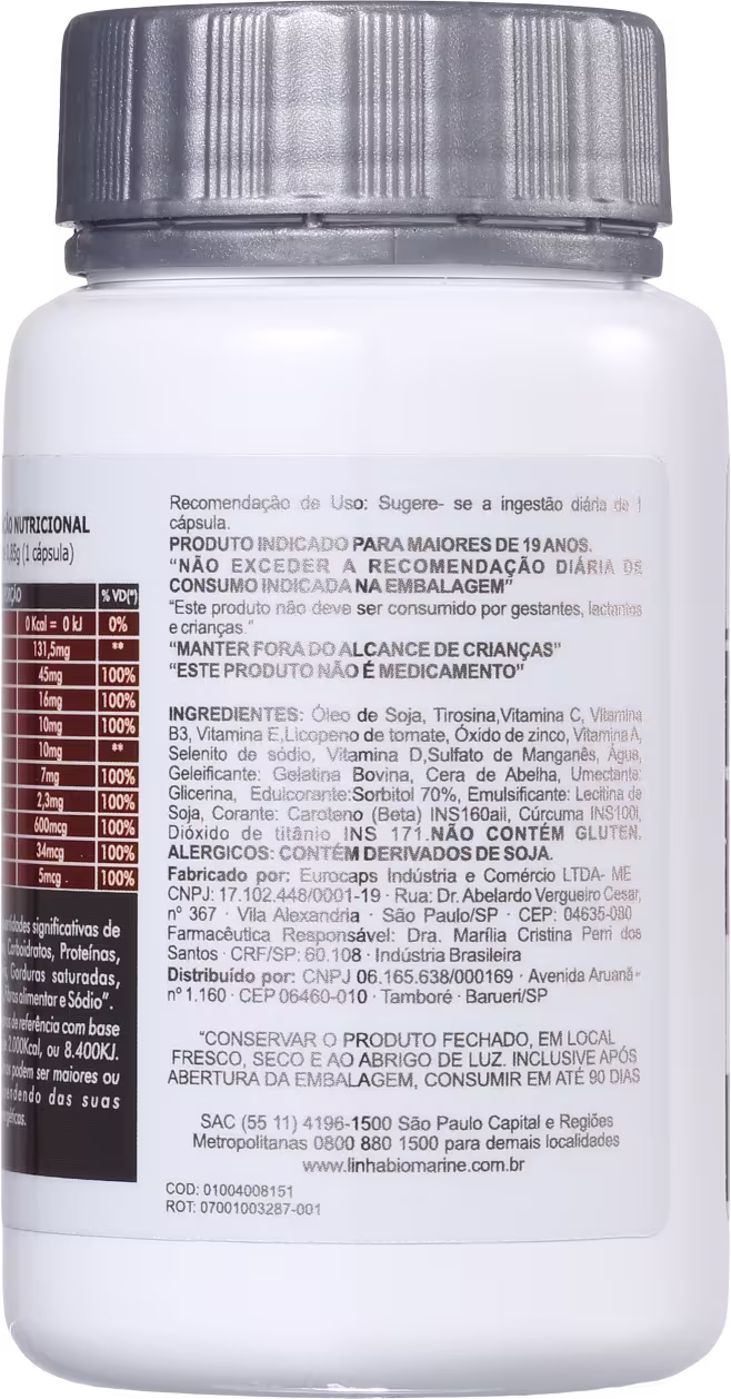 Biomarine Bioinova Bronz-IN é um suplemento alimentar rico em ingredientes que garantem um bronzeado saudável o ano todo, independente da exposição ao sol e clima. Além disso, as cápsulas oferecem proteção antioxidante contra o fotoenvelhecimento, que evita o surgimento de sinais e manchas.