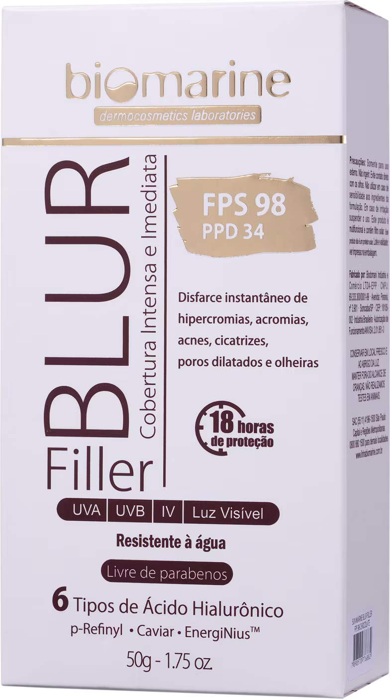 Biomarine Blur Filler FPS 98 oferece cobertura instantânea para cicatrizes, manchas, acne e linhas de expressão. Sua fórmula traz seis diferentes moléculas de Ácido Hialurônico com efeito preenchedor e hidratante.