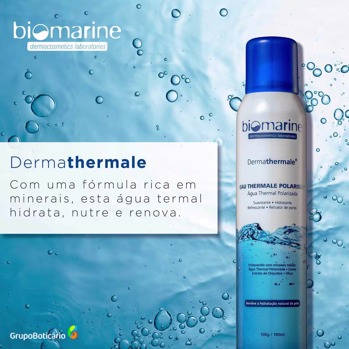 Água termal hidratante polarizada. Biomarine Dermathermale Eau Thermale Polarisée devolve instantaneamente a umectação natural do rosto, nutre e renova. Versátil, pode ser usada a qualquer momento para dar sensação refrescante.