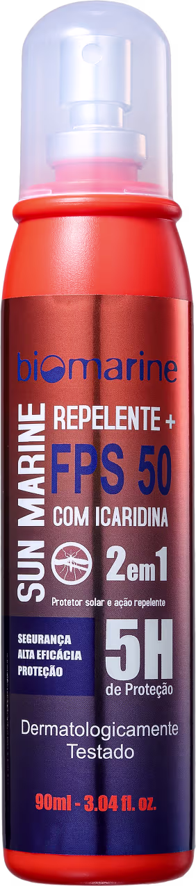 O Protetor Solar em Spray Sun Marine FPS 50 com Repelente Icaridina Biomarine protege duplamente a sua pele: contra os raios solares e os insetos. Com sua fórmula de alto fator de proteção solar também garante até 05 horas de ação repelente contra mosquitos e insetos, inclusive o mosquito que transmite dengue e Chikungunya.