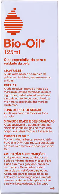O Óleo de Tratamento Bio-Oil traz em sua fórmula o exclusivo Purcellin Oil, que facilita a absorção e forma um leve filme, não gorduroso. E para que serve Bio-Oil? Sua ação previne a formação de estrias enquanto melhor a textura existentes, em casos de mudança repentina de peso, gravidez* e fatores genéticos, além de minimizar a aparência de cicatrizes e tons desiguais, novas ou antigas, como as de queloides, queimaduras, picadas de insetos, arranhões, acidentes, acne, pós-cirúrgico, catapora.