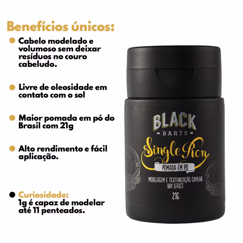 A Pomada Modeladora em Pó Black Barts Single Ron proporciona um modelar natural com movimentos que controla a oleosidade do couro cabeludo. Com excelente fixação, seu efeito é de longa duração, proporcionando controle, volume e textura aos fios na finalização do penteado. Ideal para penteados modernos e estilosos com efeito natural seco/opaco. É ótimo principalmente se você tiver um cabelo mais ralo e precisa valorizar o penteado com mais volume.