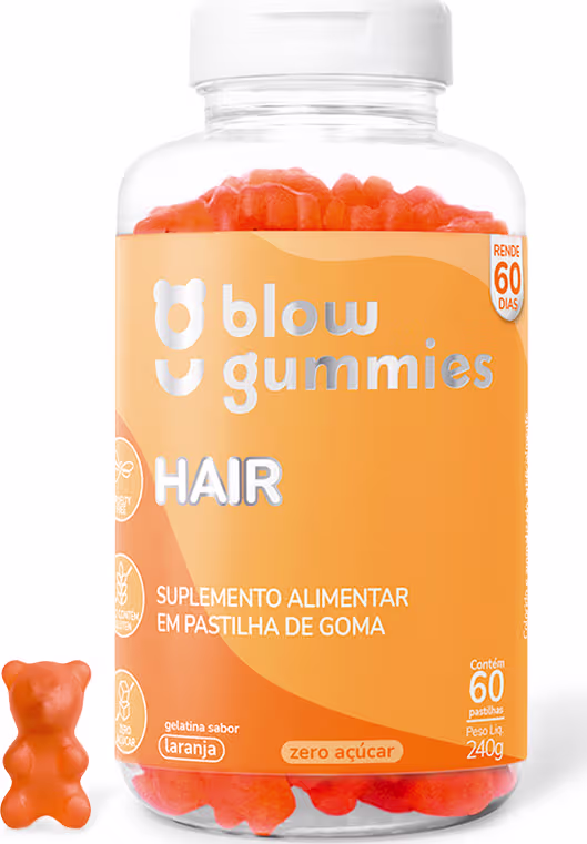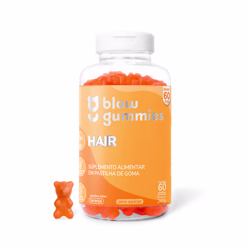 Suplemento alimentar em pastilha de goma. Blow Gummies Hair Laranja, ideal para quem busca crescer e fortalecer cabelos e unhas.