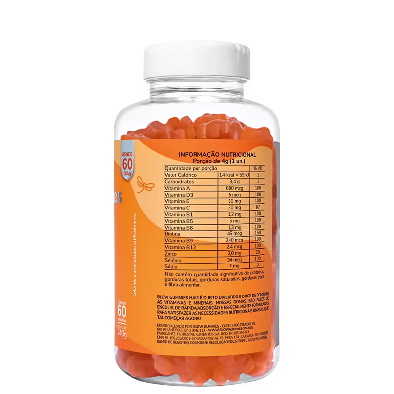 O Suplemento Alimentar Blow Gummies Hair Laranja promove desenvolvimento capilar saudável, poi sua fórmula contém vitaminas e minerais ricas que colaboram para esse objetivo. Isso inclui Biotina, Selênio, Vitamina C, Vitamina B12, Zinco , Sódio, Vitamina A, Vitamina D3, Vitamina E, Vitamina B1, Vitamina B5, e Vitamina B9. Nós, da Blow Gummies, sabemos o quanto se sentir feliz com seus próprios cabelos é necessário, por isso vamos te ajudar a alcançar seus objetivos de um jeito prazeroso!